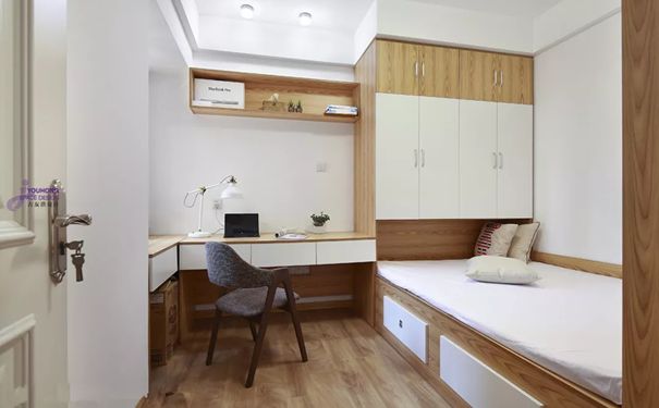 为了丰富榻榻米房的书桌,也可以取消大面积的书柜与衣柜,直接把书桌延伸到床尾,床尾的地方也可以当成座位,电脑可以充当电视,躺在床上看剧,非常不错。