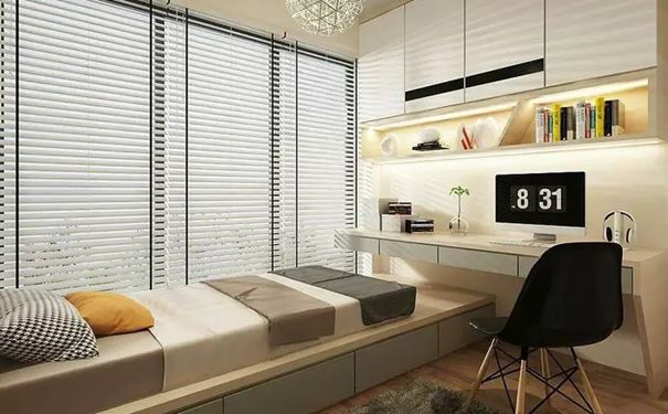 如果你希望装榻榻米的这间房既可以当卧房又可以当书房,可以选择在榻榻米床头或者床尾安装衣柜、书架和书桌,这样不仅可以收纳衣物,也可以收纳书架用来办公,一举多得。