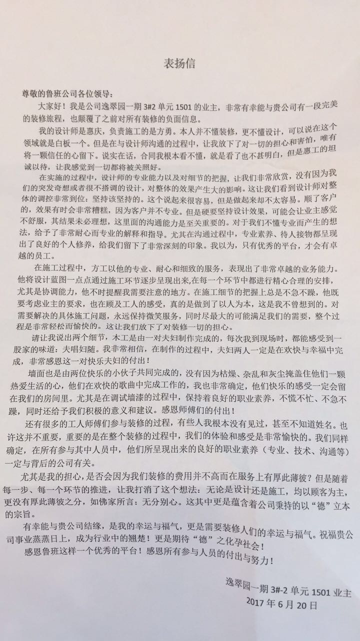 逸翠园业主写这封感谢的原因,就是为了表示感谢,感谢鲁班的服务!