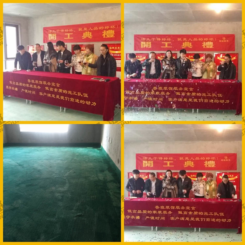 最后大家共同举杯合影留念,希望大家同心协力将工程做好!鸣响礼炮,开工仪式结束,正式宣告福宅开工!开工仪式只是装修的开始,也期待我们为更多的业主奉献上我们的高品质、专业化服务,后期的施工欢迎广大业主参观、指导、监督,您的关注是我们进步的动力!陕西鲁班装饰公司在施工地免费参观预约热线:029-88921809。