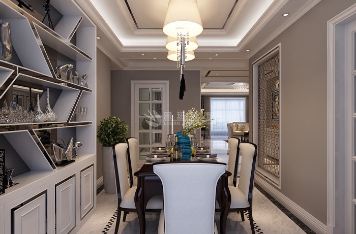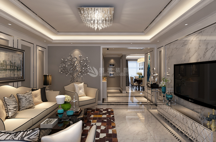 材质选择上我采用微晶石系列地砖和石材的相互对比结合,电视墙的白色和地面的深色地砖很好的将房子的层次感展现出来,包括吊顶的斜边很好的增加了房子的现代感也增加了中央空调的出风顺畅。