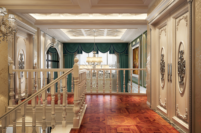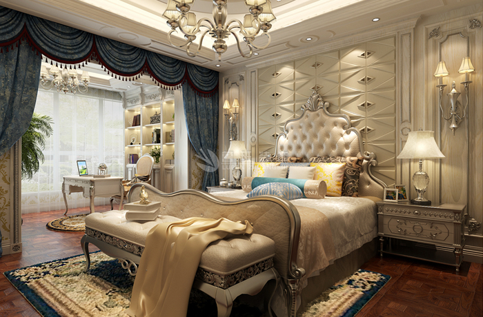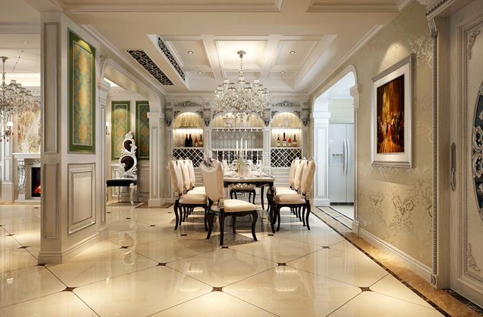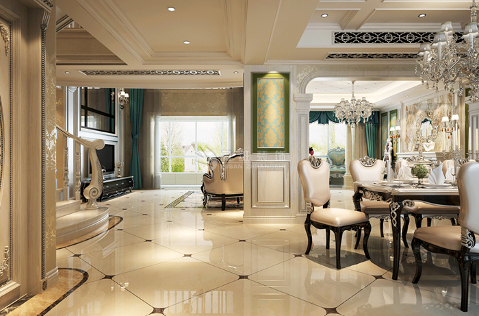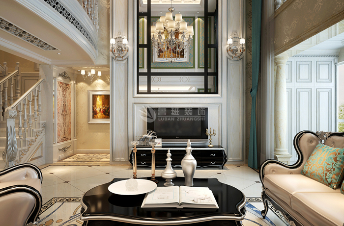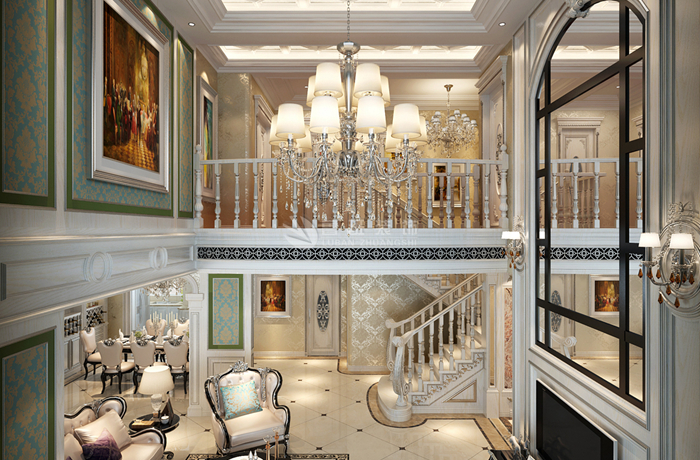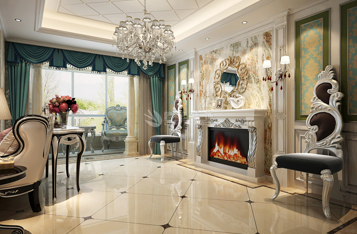 欧式风格强调以华丽的装饰、浓烈的色彩、精美的造型达到华贵的装饰效果。欧式客厅顶部用大型灯池,并用华丽的枝形吊灯营造气氛。门窗上半部做成弧形,并用带有花纹的石膏线勾边,室内则有壁灯造型。墙面用优质乳胶漆,以衬托豪华效果。地面材料以石材和地板为主。欧式客厅用家具和软装饰来营造整体效果,深色的像木和枫木家具,色彩鲜艳的布艺沙发,都是本案欧式客厅里的主角。还有浪漫的罗马帘,精美的油画,制作精良的雕塑工艺品,都是点染欧式风格不可缺少的元素。客厅的大部分在挑空结构之下,大面积的玻璃窗带来了良好的采光,落地的窗帘很是气派。布艺沙发组合有着丝绒的质感以及流畅的木质曲线,将传统欧式家居的奢华与现代家居的实用性完美地结合。壁灯自然不可或缺,它被安置在空间的交汇处,又与四幅色彩鲜艳的油画相呼应,给敞开式的客厅提供了一个新的亮点。